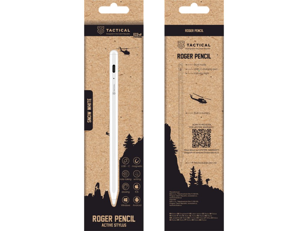 Co si nepamatuješ, zapiš si! Co Tě napadne namaluj! A fantazii nech vyniknout, jako kdybys maloval na papír. Představujeme Tactical Roger Pencil. Dotykové pero se dvěma módy. První určený speciálně pro iPad a druhý mód pro ostatní tablety a telefony. Rychlost mrknutí okem Až tak rychle se Tactical Roger Pencil spáruje s Tvým zařízením. Soustřeď se na svou kreativitu a myšlenkové procesy. Nepřemýšlej nad zbytečnými věcmi. Mysli takticky! Přesnost S displejem je kamarád. Dotyk s displejem je na pixel přesný, nikde nic neutíká a reaguje s nulovou odezvou zpoždění. Při používání buď v klidu a ruku si klidně opři o dotykovou obrazovku. Displej na ní nebude reagovat. Reguluj tloušťku čáry a žádné ořezávátko k tomu nepotřebuješ. Zůstaň aktivní Tactical Roger Pencil pracuje na principu aktivní technologie. To znamená, že na kompatibilních zařízeních využijete přítlak a další funkce. Je naprosto intuitivní a dokonale simuluje psaní a kreslení na papíře. Jedinečný design Tak těžký, jak je potřeba. Dostatečně velký na to, aby simuloval skutečné pero. LED indikace Tě nenechá ve štychu a ukáže zbývající kapacitu baterie. Jednoduchým poklepáním pero zapneš, vypneš nebo přepneš iPad mód. Díky magnetickému tělu lze pero jednoduše přichytit k iPadu nebo k ostatním tabletům. LED barvy Tactical Roger Pencil Ti dá vždy vědět, co se děje. Zelené světlo znamená mód zapnuto a připraveno k použití na iPad se všemi funkcemi. Po dalším klepnutím na dotykové tlačítko se rozsvítí modré světlo. To aktivuje univerzální mód. Nyní můžeš pero používat na jakémkoliv zařízení. Červené světlo signalizuje nabíjení. Po úplném nabití se červené světlo vypne. Neodolatelně odolný U nás v Tactical dbáme na to, aby věci něco vydržely. Dotykové pero v této kategorii nabízí jen to nejlepší. iPad mód, aktivní technologii, luxusní hliníkovou konstrukci, magnetický úchyt, vyměnitelný hrot s velice jemnou silou odezvy, který používají jen top modely na trhu a spoustu dalších funkcí. Nabízí inteligentní úsporný režim - to znamená rok bez starostí. A osmihodinovku v práci dáš na jedno nabití. BE ECO My v Tactical máme rádi přírodu. Všechny naše produkty jsou balené do ECO krabiček z recyklovaného papíru tak, aby co nejméně zatěžovaly životní prostředí. Myslete takticky!