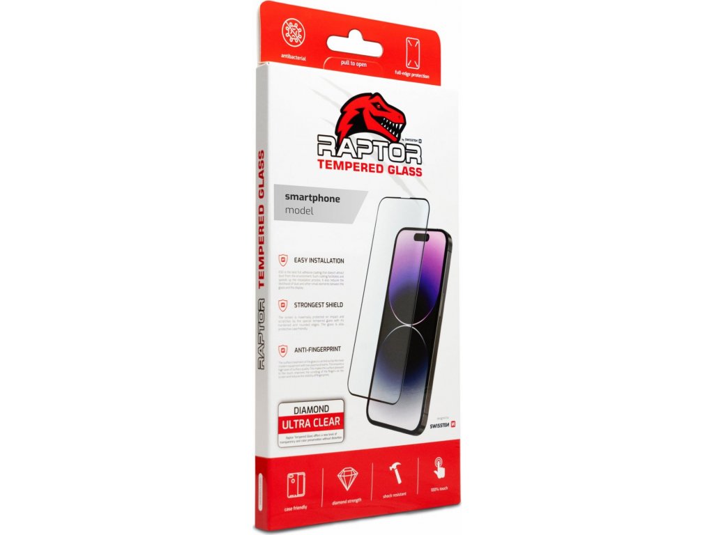 Dokonale čiré temperované sklo Swissten Raptor z kategorie "Case Friendly" s tvrzenými, zaoblenými hranami, oleofobní antibakteriální vrstvou a velkou pevností. Baleno v blistru SWISSTEN.