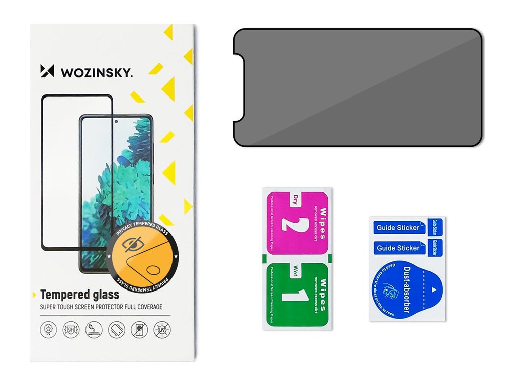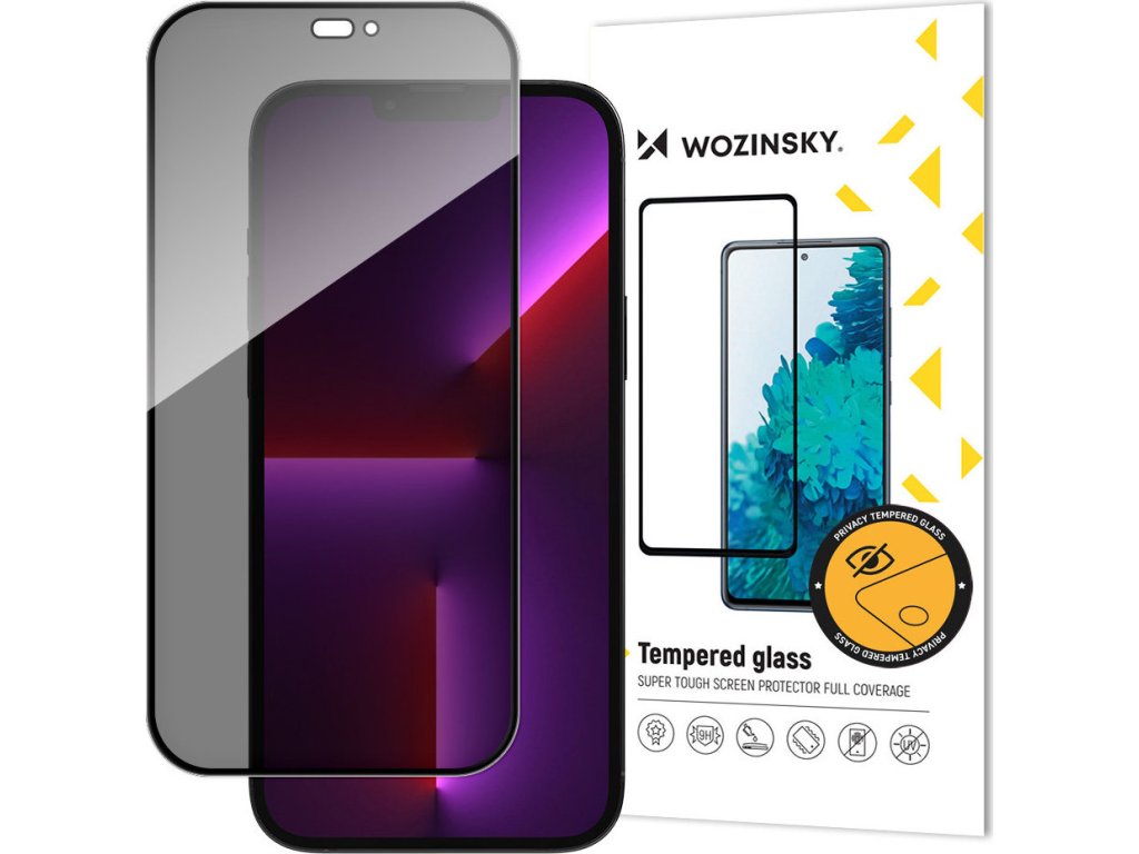 Tvrdené sklo Wozinsky pre Samsung Galaxy iPhone 15, čierne, so zakriveným povrchom a antispy filtrom.