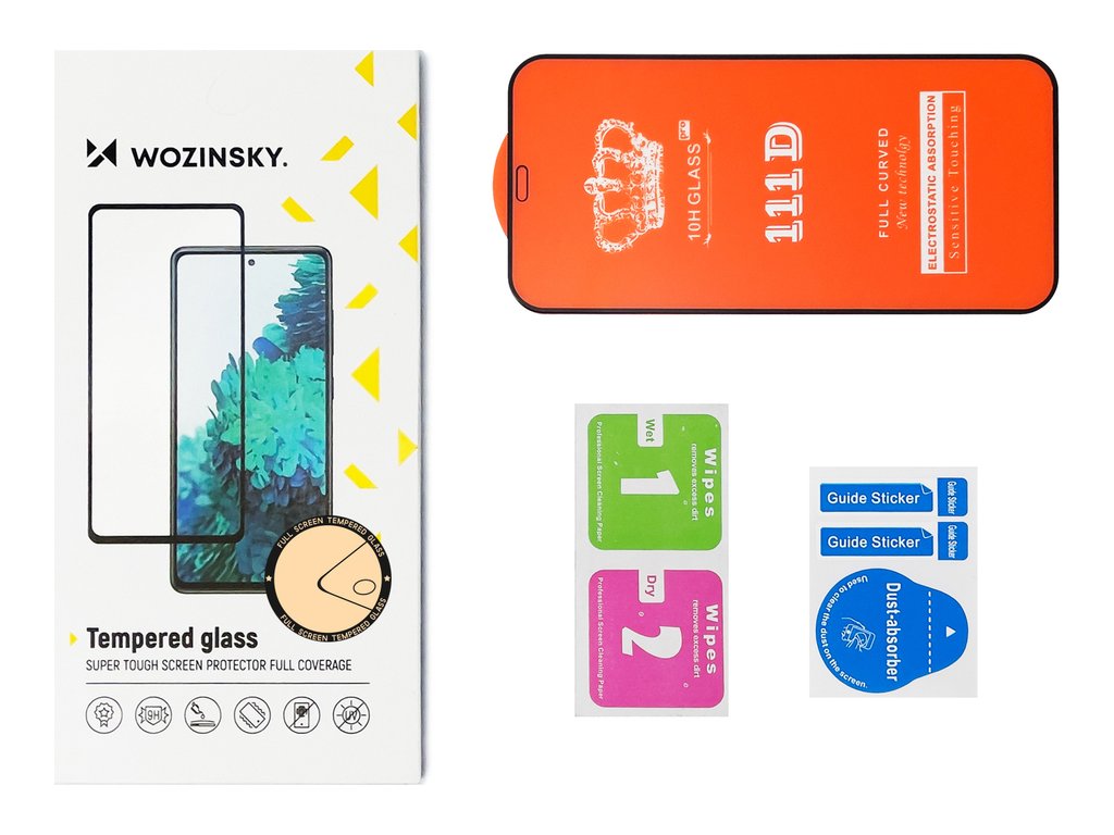 Tvrzené sklo Wozinsky Full Glue zaručuje spolehlivou ochranu displeje. I když vám telefon upadne, displej zůstane neporušený. Díky tvrdosti 9H je odolnější proti poškrábání než standardní ochranné sklo. Sada obsahuje také příslušenství pro snadnou aplikaci: hadřík na čištění displeje a samolepky na odstranění prachu, které zajišťují dokonalé přilnutí bez bublin.