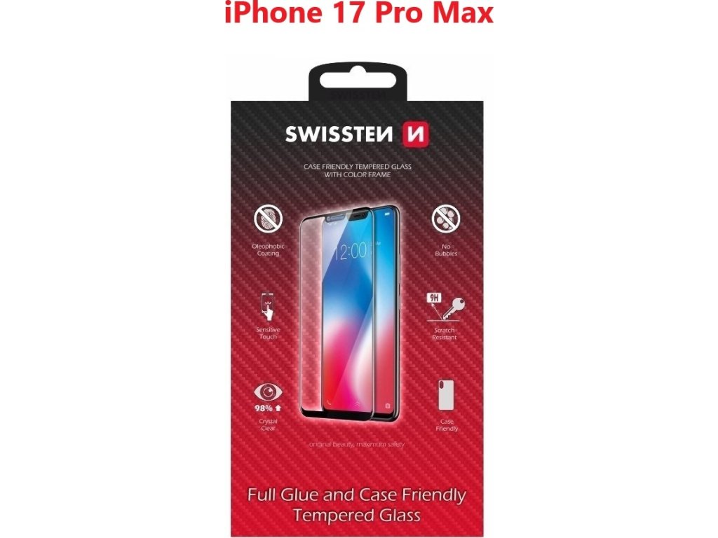 SKLO SWISSTEN FULL GLUE, COLOR FRAME, CASE FRIENDLY PRO APPLE IPHONE 17 PRO MAX ČERNÉ