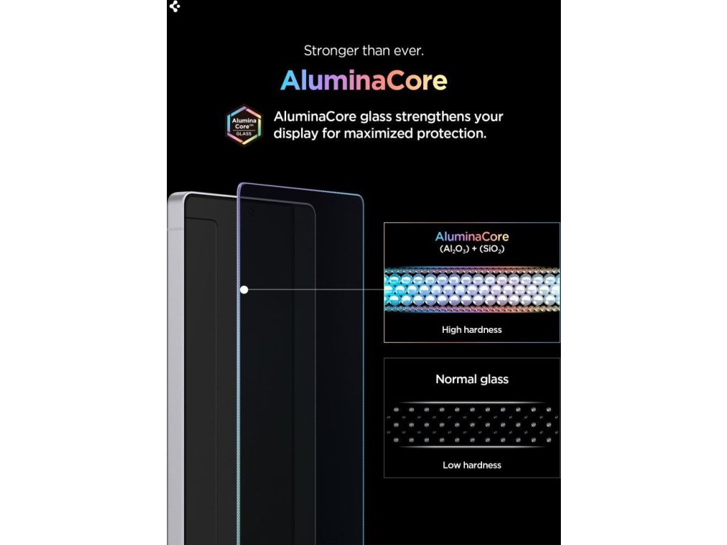 Technologie AluminaCore využívá vrstvu oxidu hlinitého a oxidu křemičitého k vytvoření struktury s tvrdostí 10H+, která je výrazně pevnější než standardní tvrzené sklo. Vícevrstvá konstrukce se skládá z oleofobní vrstvy pro snížení usazování otisků prstů, vrstvy tvrzeného skla 10H, vrstvy OCA, nerozbitné fólie, silikonové pryskyřice a ochranné fólie. Celá struktura absorbuje nárazy a účinně chrání obrazovku před poškrábáním a mechanickým poškozením. Sklo prošlo vojenským testem pádu PASS.