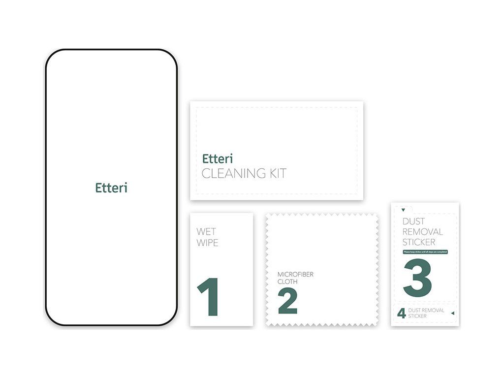 V balení naleznete vše potřebné pro úspěšné nalepení: kromě samotného tvrzeného skla Etteri jsou součástí také montážní doplňky pro důkladné očištění displeje před aplikací.