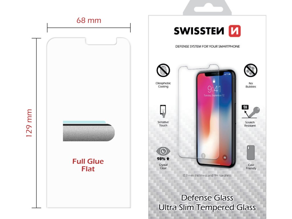 Spodní vysoce adhesivní část s tenkou silikonovou vrstvou, která výrazně zjednodušší aplikaci. Sklo je opatřeno speciální oleofobní vrstvou - vysoká citlivost. Tvrdost 9H. Tloušťka 0,3 mm. Zaoblené hrany.