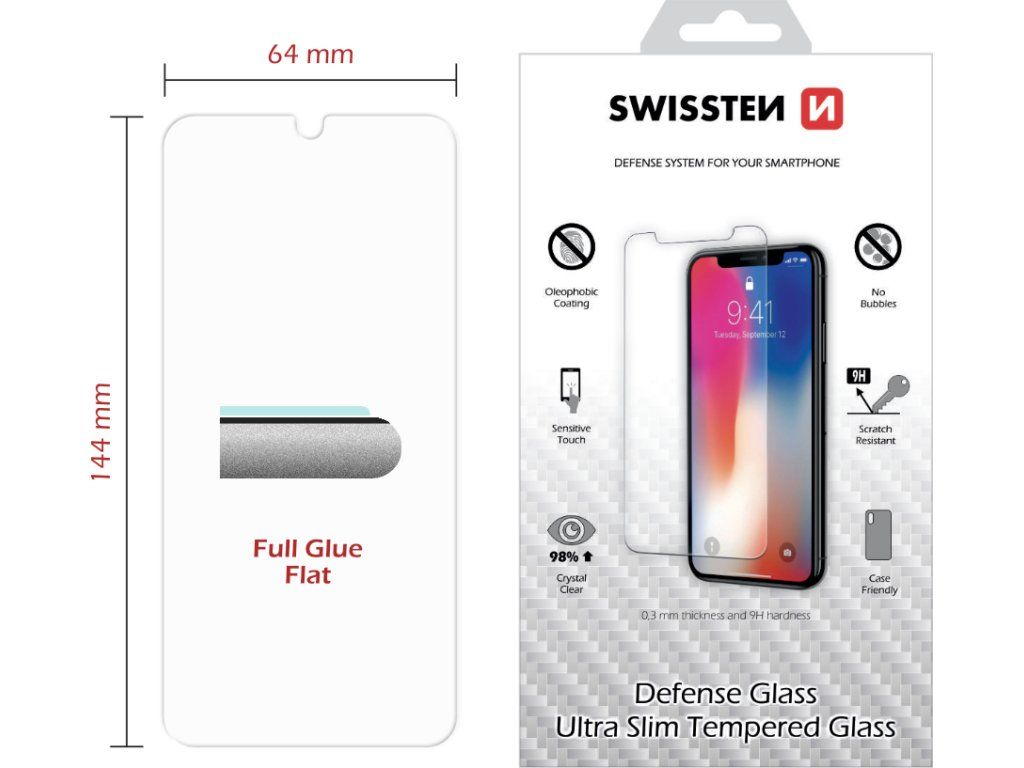 Spodní vysoce adhesivní část s tenkou silikonovou vrstvou, která výrazně zjednodušší aplikaci. Sklo je opatřeno speciální oleofobní vrstvou - vysoká citlivost. Tvrdost 9H. Tloušťka 0,3 mm. Zaoblené hrany.