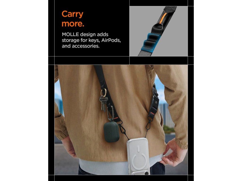 Šňůrka na zápěstí je vybavena magnetickou rychloupínací přezkou, která umožňuje rychlé odpojení a opětovné připevnění řemínku na zápěstí. Vestavěná poutka umožňují připevnění dalšího příslušenství, jako jsou AirPods, klíče nebo karabiny, a vytvářejí tak kompletní systém pro nošení vašich nezbytných věcí denní potřeby.