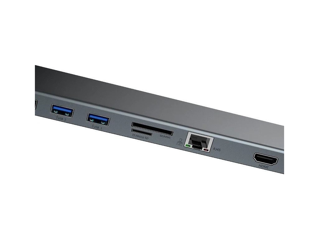 Zařízení má jedenáct portů: 3 USB 3.0, čtečka karet SD a Micro SD, 2 výstupy pro kabel HDMI, vstup pro síťový kabel RJ45, výstup VGA, USB-C (PD) a 3,5mm audio port.