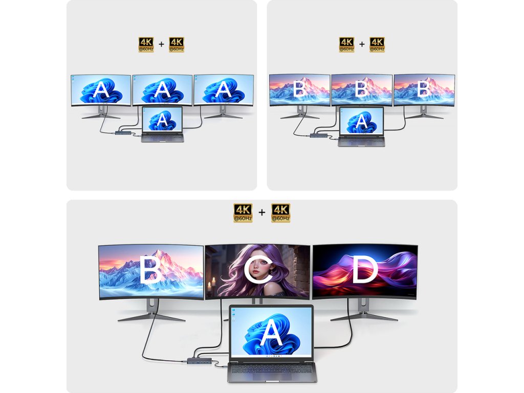 - Podpora troch 4K monitorov: Vybavený 2 × HDMI a 1 × DisplayPort – fungujú v rozšírenom (MST) alebo zrkadlovom (SST) režime.