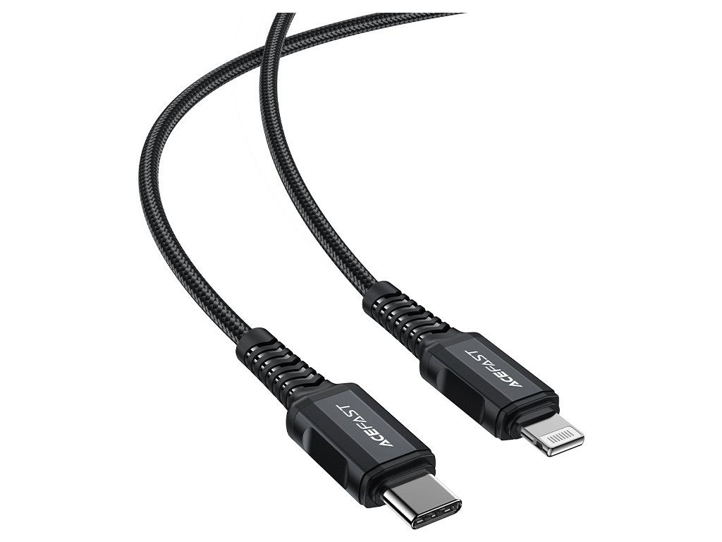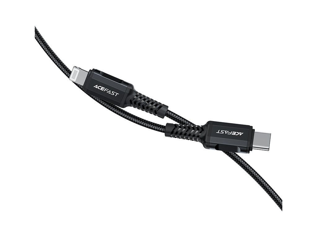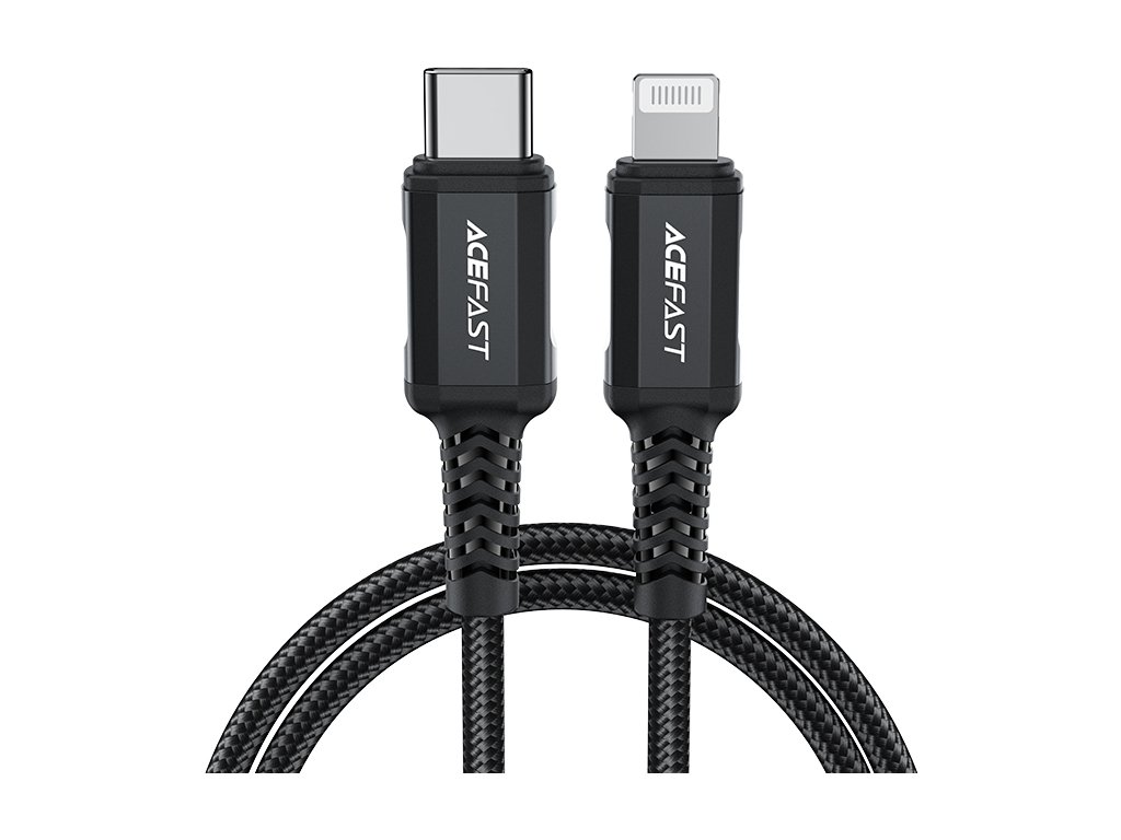 Kabel Acefast USB Type-C - Lightning pro nabíjení a přenos dat. Je určen pro zařízení Apple s konektorem Lightning. Je dlouhý 180 cm a je navržen pro provoz s proudem 30 W a 3 A. Je kompatibilní s rychlonabíjením Power Delivery. Má certifikaci MFI (Maide For iPhone), takže telefon nezobrazí hlášení o neoriginálním příslušenství. Celá délka kabelu je opletena nylonem. Zástrčky mají hliníkové pouzdro. Konce kabelu mají krytky, které zabraňují poškození v místech, kde se nejčastěji ohýbají.