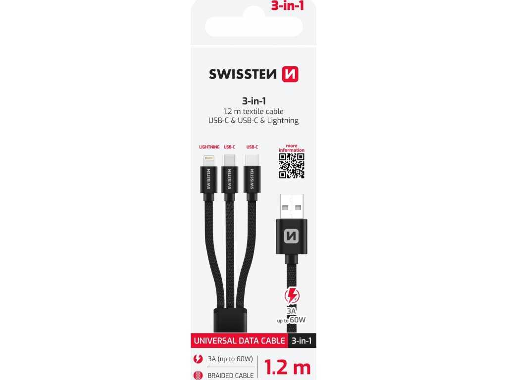 SWISSTEN DATOVÝ KABEL TEXTILE 3in1 1,2 M ČERNÝ (Lightning, 2x USB-C)