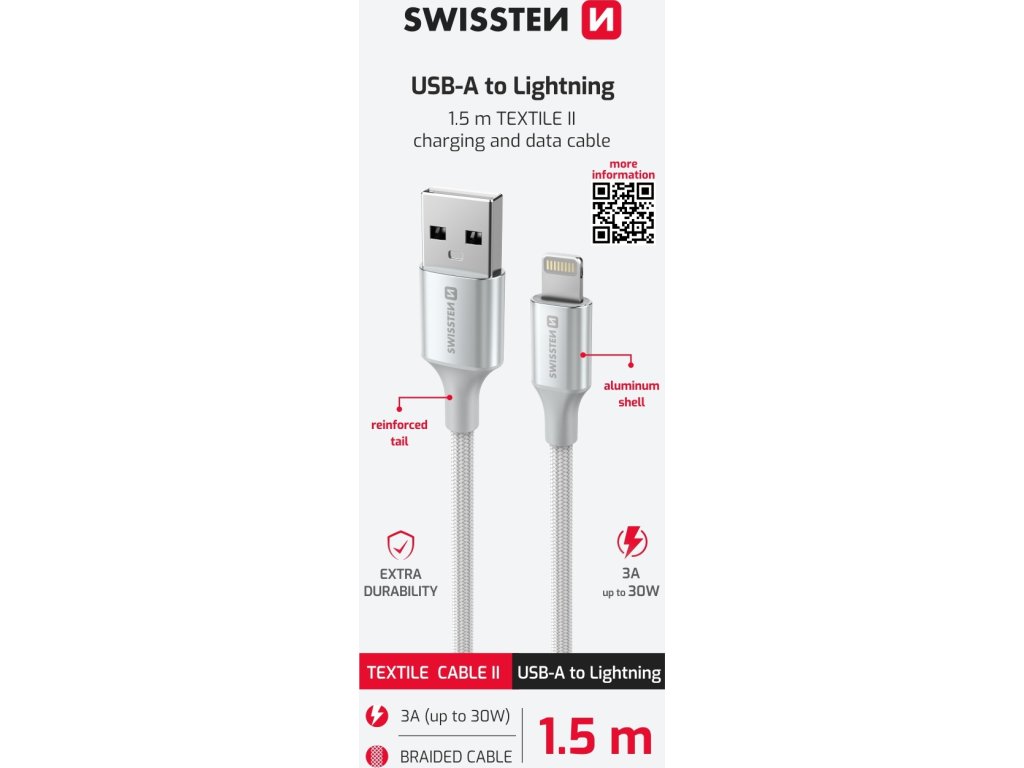 Swissten textilní kabel II s datovým přenosem, USB-A - LIGHTNING, Délka: 1.5 metrů, Proud v kabelu: 3 A, Rychlost přenosu dat: 480 Mb/s. Baleno v blistru Swissten.