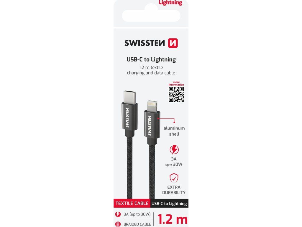 DATOVÝ KABEL SWISSTEN TEXTILE USB-C / LIGHTNING 1,2 M ČERNÝ