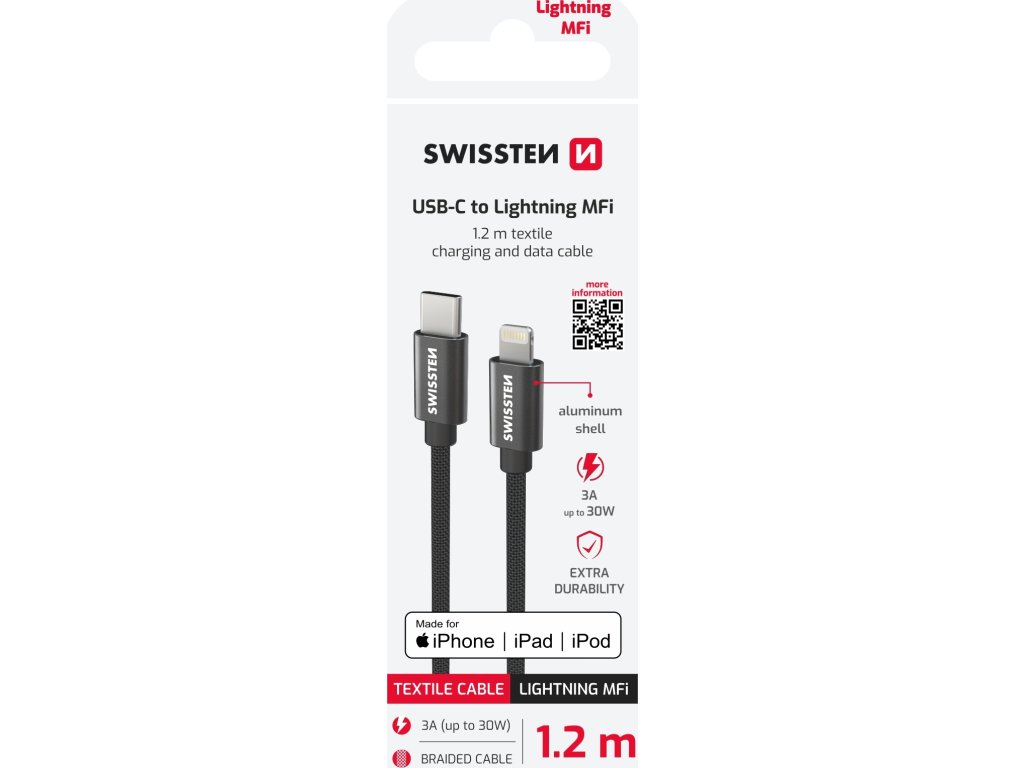 Kabel je licencovaný společností Apple. Datový kabel Swissten USB-C/Lightning s kvalitním textilním opletením. Díky délce 1,2m je vhodný do auta, na stůl v kanceláři nebo na noční stolek.