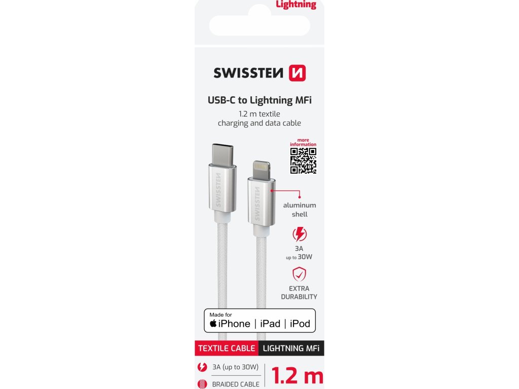 DÁTOVÝ KÁBEL SWISSTEN TEXTILE USB-C / LIGHTNING MFi 1,2 M STRIEBORNÝ