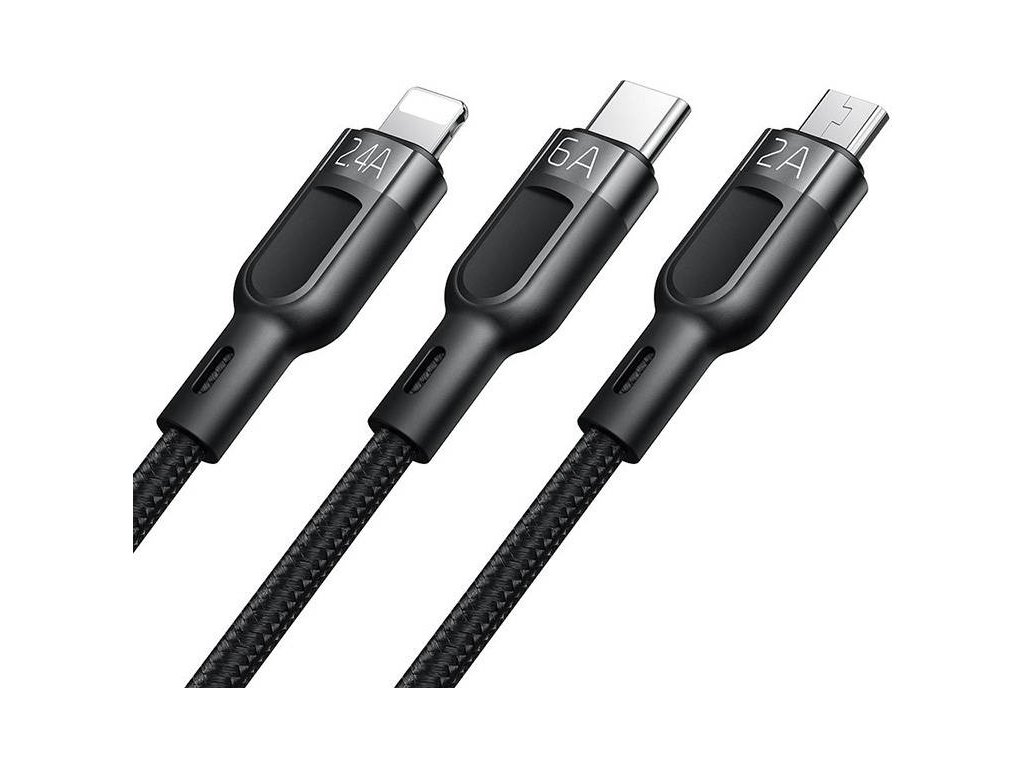Nyní můžete bezproblémově nabíjet více zařízení najednou! Kabel je vybaven 3 různými konektory - USB-C, Lightning a microUSB. S jeho pomocí tak úspěšně obnovíte energii různých zařízení. Skvěle se bude hodit pro nabíjení smartphonů, tabletů, bezdrátových sluchátek nebo powerbank.
