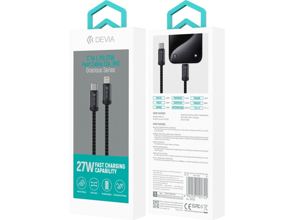 Kabel Devia Gracious EC645 PD USB-C - Lightning 1,0 m 27W 3A černý