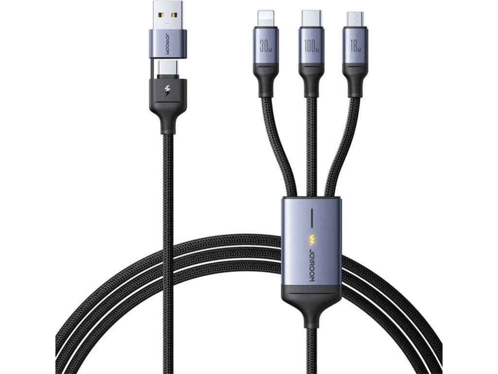 Kabel úspěšně připojíte k různým typům zařízení a rychle obnovíte jejich energii. Joyroom SA21-2T3 je kabel 6 v 1, který nabízí vstupní porty USB-A a USB-C a 3 výstupní porty pro Lightning, USB-C a Micro USB, které využívají energii v tomto pořadí: 30 W, 100 W a 18 W. Nylonové opletení a použití hliníkové slitiny se navíc promítá do odolnosti a dodatečné zesílení pod konektorem zajišťuje odolnost proti ohýbání a praskání.