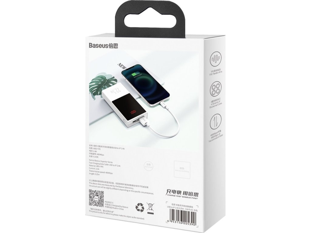 Výrobek podporuje rychlé nabíjení 2,4 A. To znamená, že dokáže okamžitě nabít váš iPhone, což vám umožní ušetřit čas! Už nemusíte věčně čekat, než bude váš smartphone opět připraven k provozu - s Baseusem to trvá jen pár okamžiků.
