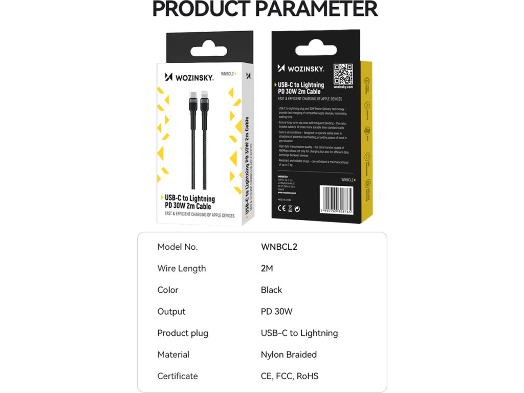 Kabel Wozinsky WNBCL2 Lightning / USB-C PD 30W 2 m - černý