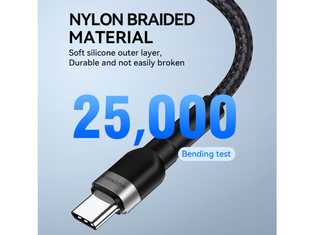 Díky nylonovému opletení je kabel Wozinsky WNBCL2 připraven k intenzivnímu používání. Tento materiál zvyšuje jeho odolnost proti ohybu, což umožňuje kabelu vydržet až 25 000 ohybů bez ztráty kvality.