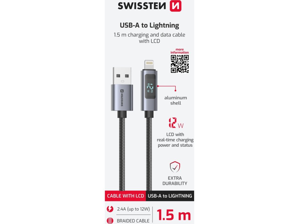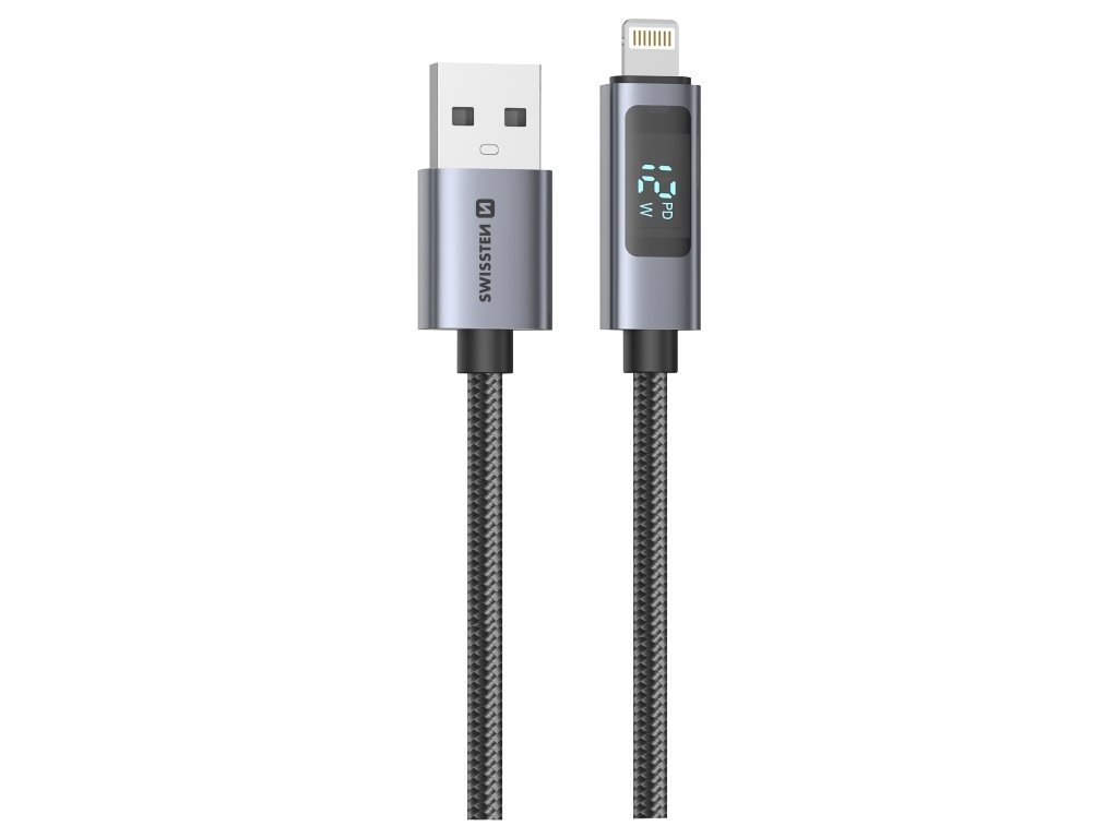 SWISSTEN LCD kabel USB-A / Lightning 1,5 m s displejem, Zobrazuje výkon nabíjení ve wattech, Indikace Power Delivery. Podpora rychlého nabíjení až 30W, Odolné opletení, Vysoká životnost. Baleno v blistru SWISSTEN.