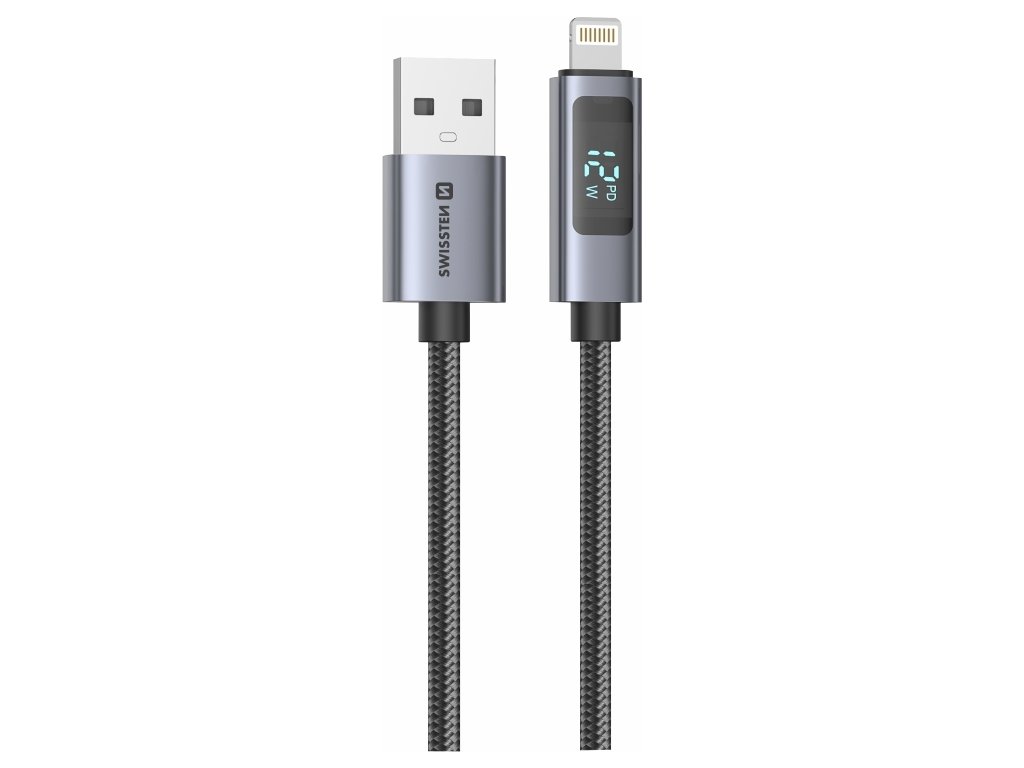 SWISSTEN LCD kabel USB-A / Lightning 1 m s displejem, Zobrazuje výkon nabíjení ve wattech, Indikace Power Delivery. Podpora rychlého nabíjení až 30W, Odolné opletení, Vysoká životnost. Baleno v blistru SWISSTEN.