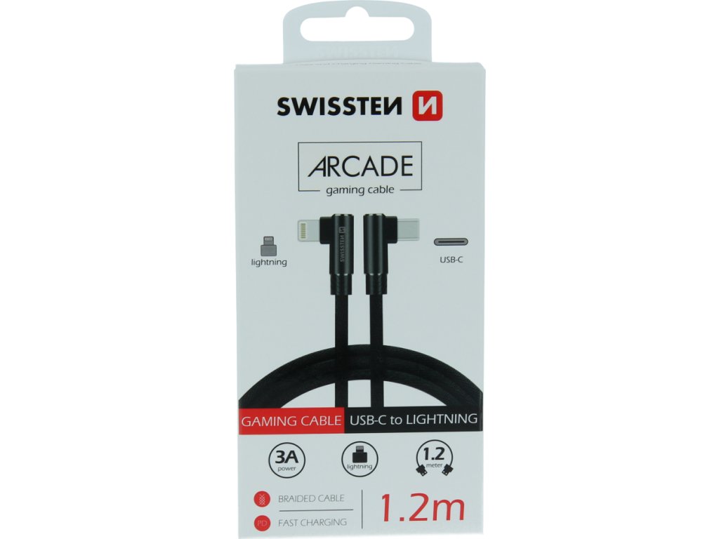 Datový a nabíjecí kabel Swissten Arcade je dlouhý 1,2 m a má konektor do L pro pohodlné nabíjení při hraní her nebo sledování videa. Kabel je zesílený a přenese tak větší proud (až 3A) a zvládne i rychlý přenos dat 480 Mb/s. Baleno v blistru Swissten