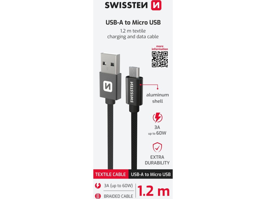 Datový kabel Swissten USB/micro USB s kvalitním textilním opletením. Díky délce 1,2m je vhodný do auta, na stůl v kanceláři nebo na noční stolek. Kabel je zesílený a přenese tak větší proud (až 3A) a zvládne i rychlý přenos dat 480 Mb/s.