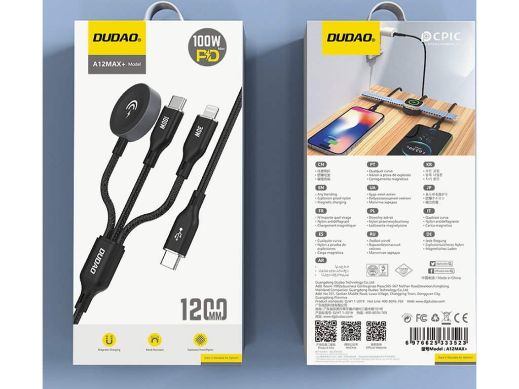 Kabel Dudao A12Max+ nabízí výjimečnou všestrannost, je vybaven třemi nejoblíbenějšími konektory: USB-C, Lightning a nabíječkou pro Apple Watch. Díky tomu můžete nabíjet téměř všechna elektronická zařízení - chytré telefony, tablety, notebooky a Apple Watch. Bez ohledu na to, jaké zařízení máte, máte vždy po ruce ten správný kabel, což eliminuje nutnost nosit několik různých kabelů v tašce nebo batohu.