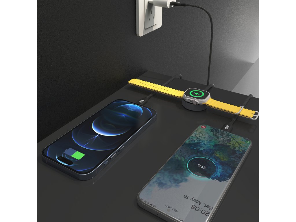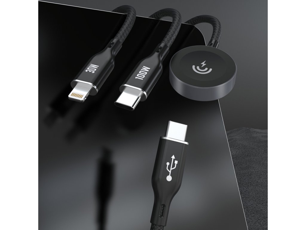 - Všestrannost 3 v 1: Kabel nabízí tři různé konektory: bezdrátovou nabíječku, USB-C a Lightning, což umožňuje nabíjet řadu zařízení – od telefonů přes tablety až po Apple Watch.