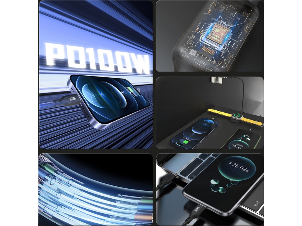 - Podpora nabíjení notebooků: Díky 100W USB-C výstupu dokáže kabel nabíjet nejen mobilní zařízení, ale i notebooky a tablety, což z něj činí ideální volbu pro práci i cestování.