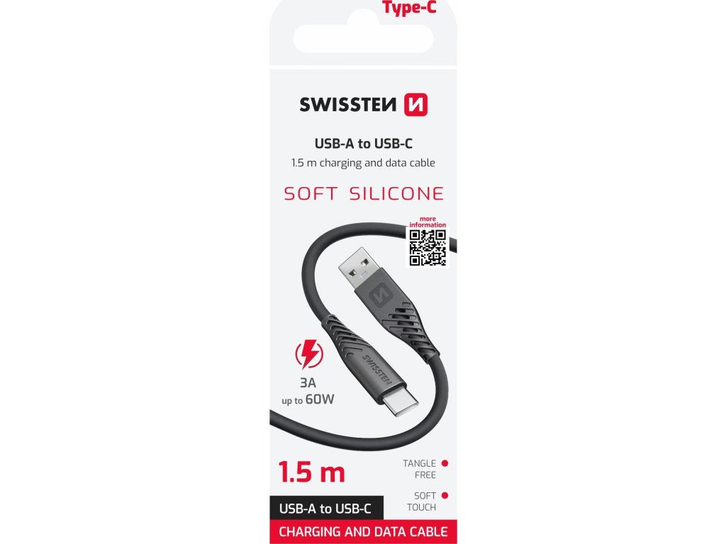 Ohebný, flexibilní a datový kabel SWISSTEN SOFT SILICONE USB-A / USB-C , Délka: 1,5m, Výkon: 60W, Proud: až 3A. Baleno v blistru SWISSTEN.