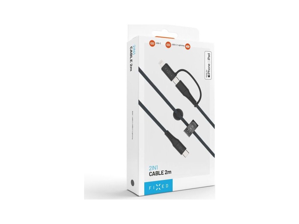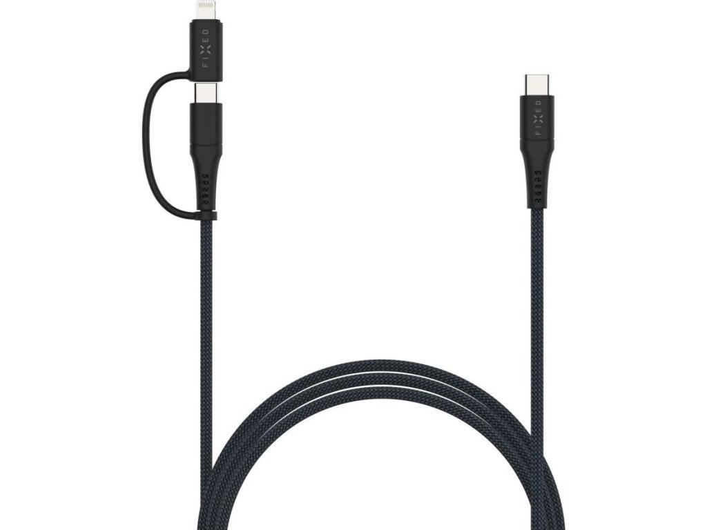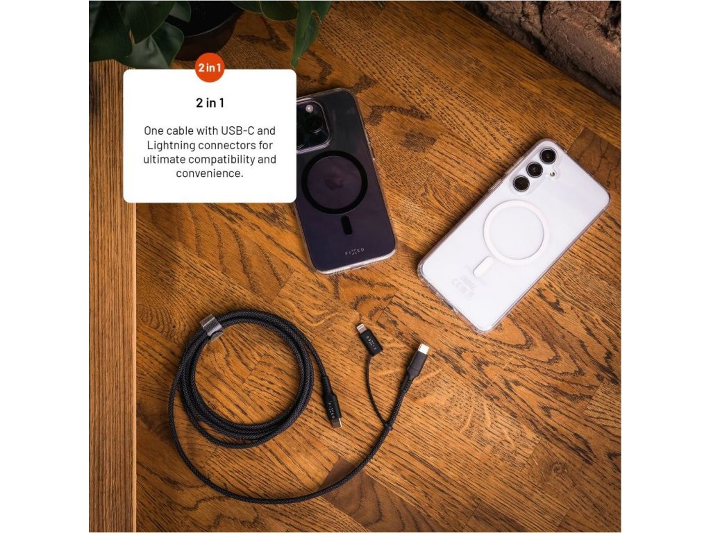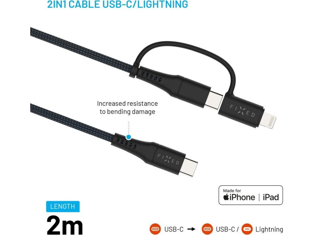 Dlouhý nabíjecí a datový opletený kabel FIXED s konektory USB-C/USB-C a Lightning adaptérem, PD, 2m, MFi, PD 60W, šedý