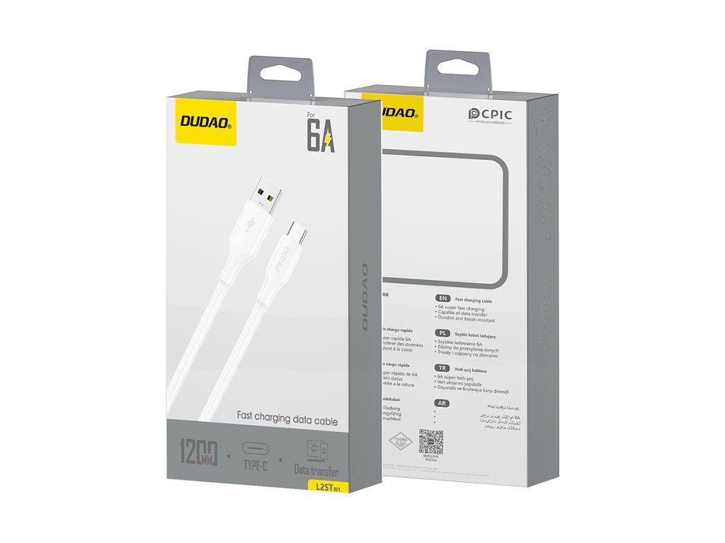 Dudao L2sT je nabíjecí a datový kabel s konektory USB-A a USB-C, který podporuje proudy až 6 A. Jeho robustní konstrukce a odolný PVC povlak zajišťují odolnost pro každodenní použití a dlouhou životnost kabelu. Kabel zaručuje rychlé a bezpečné nabíjení zařízení s USB-C a stabilní synchronizaci dat. Díky délce 1,2 m je ideální pro domácnost, kancelář i cesty. Bílá barva mu dodává elegantní a všestranný vzhled.