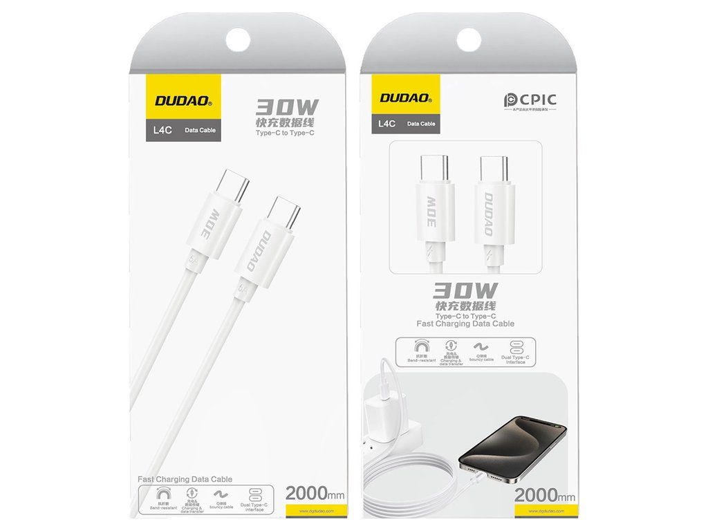 Kabel Dudao L4C s konektory USB-C a USB-C, výkon až 30 W a délka 2 m - bílý