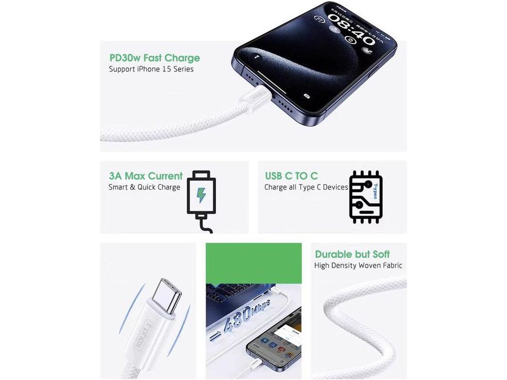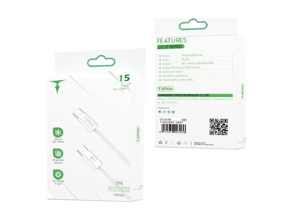 Kabel T-PHOX řady CC15 USB-C/USB-C 60W 3A BÍLÝ