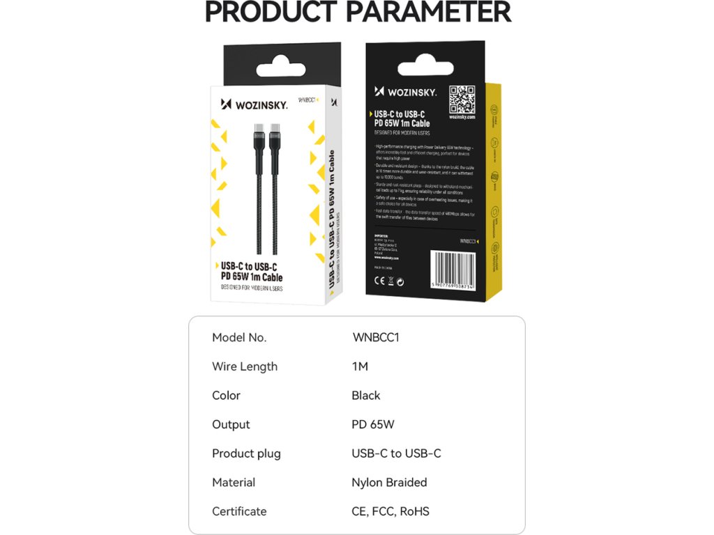 Kabel Wozinsky WNBCC1 využívá pokročilou technologii Power Delivery 65W, která zajišťuje nejen rychlost nabíjení, ale i jeho účinnost. Jedná se o ideální řešení pro moderní zařízení, která vyžadují vysoký výkon. Použitím tohoto kabelu můžete zkrátit dobu potřebnou k plnému nabití vašeho zařízení.