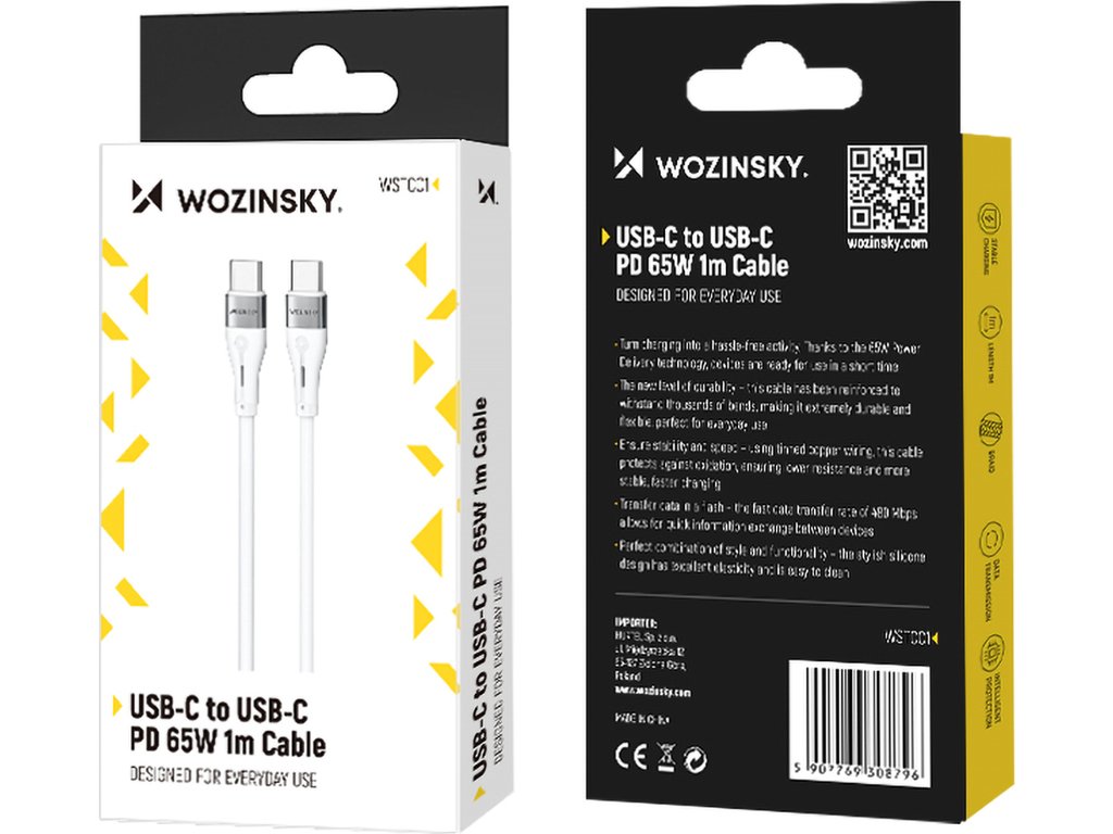 Kabel Wozinsky WSTCC1 využívá moderní technologii Power Delivery s výkonem 65 W, která umožňuje okamžité nabíjení kompatibilních zařízení. Ať už nabíjíte chytrý telefon, tablet nebo notebook, technologie PD zajišťuje maximální účinnost.
