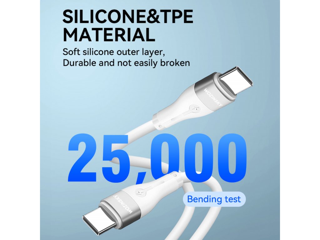 Minimalistický styl a silikonová konstrukce kabelu Wozinsky WSTCC1 kombinují eleganci s funkčností. Silikon je nejen odolný materiál, ale také flexibilní a snadno se čistí, což kabelu dává pohodlné každodenní používání.
