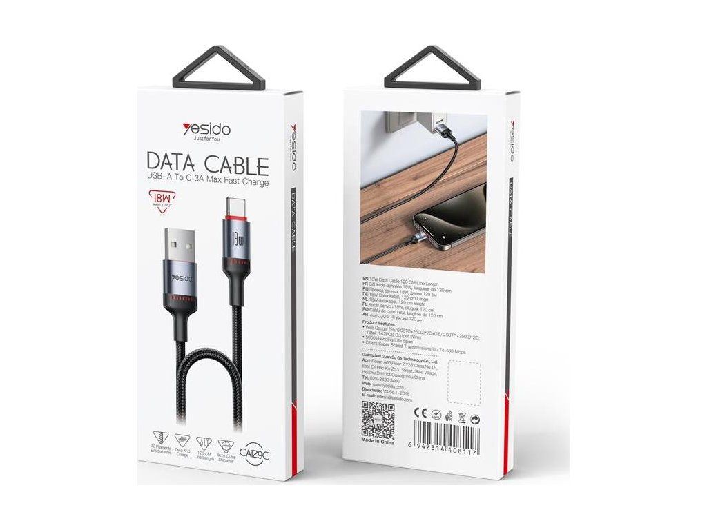 Kabel YESIDO CA129C 18W USB/TYPE-C 1,2M 2A Černý