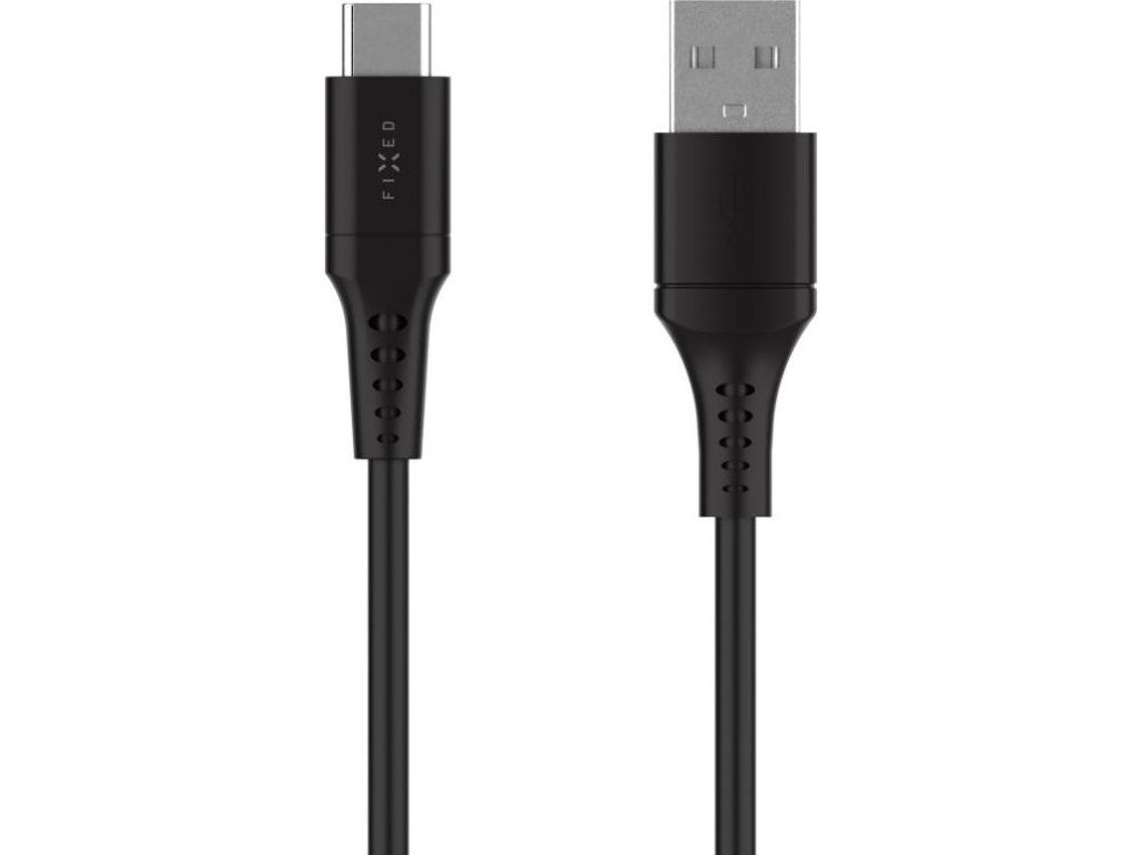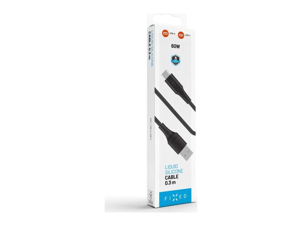 Krátký nabíjecí a datový Liquid silicone kabel FIXED s konektory USB/USB-C a podporou PD, 0.3m, USB 2.0, 60W, černý