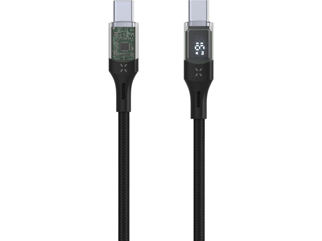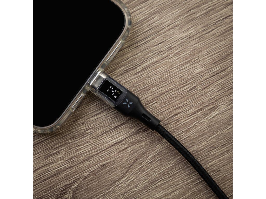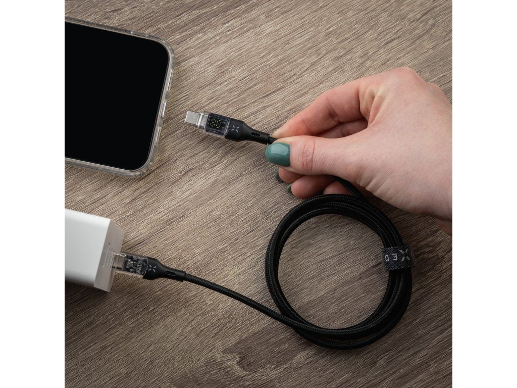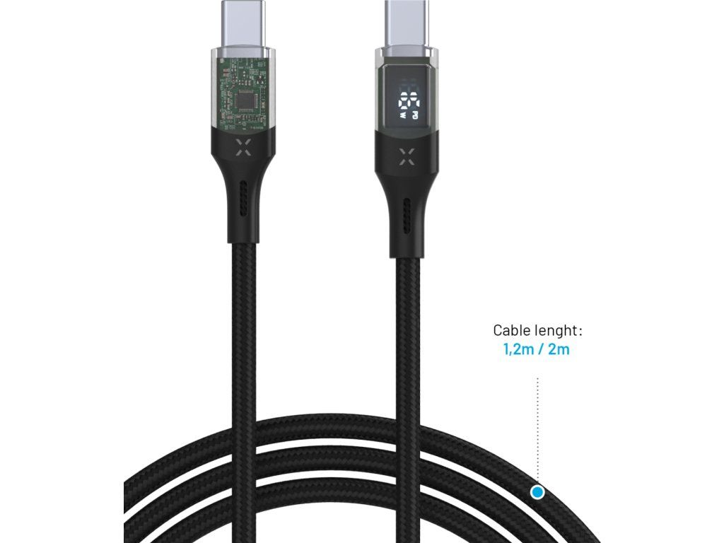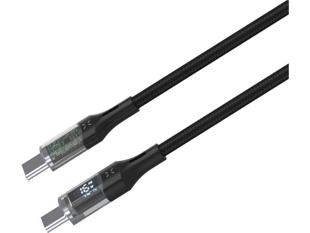 Datový a nabíjecí kabel FIXED s průhlednými konektory a digitálním displejem je unikátně řešeným příslušenstvím. Transparentní koncovky kabelu odhalují běžně skryté spoje a mikročipy, což z kabelu dělá nejen praktický, ale také designový doplněk. LED displej přehledně informuje o aktuálním nabíjecím výkonu kabelu a zároveň o tom, zda je podporována technologie rychlého nabíjení. Pro nabíjení nabízí vysoký výkon až 100 W s podporou Power Delivery 3.0. a zároveň umožňuje také přenos dat o rychlosti 480Mbps ve standardu USB 2.0. Černý textilní oplet zvyšuje odolnost kabelu. Kabel je v provedení s konektory USB-C/USB-C s délkou 1,2 m.