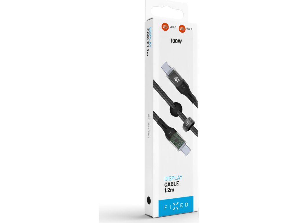 Nabíjecí a datový kabel FIXED s displejem s konektory USB-C/USB-C a podporou PD, 1.2m, USB 2.0, 100W, černý