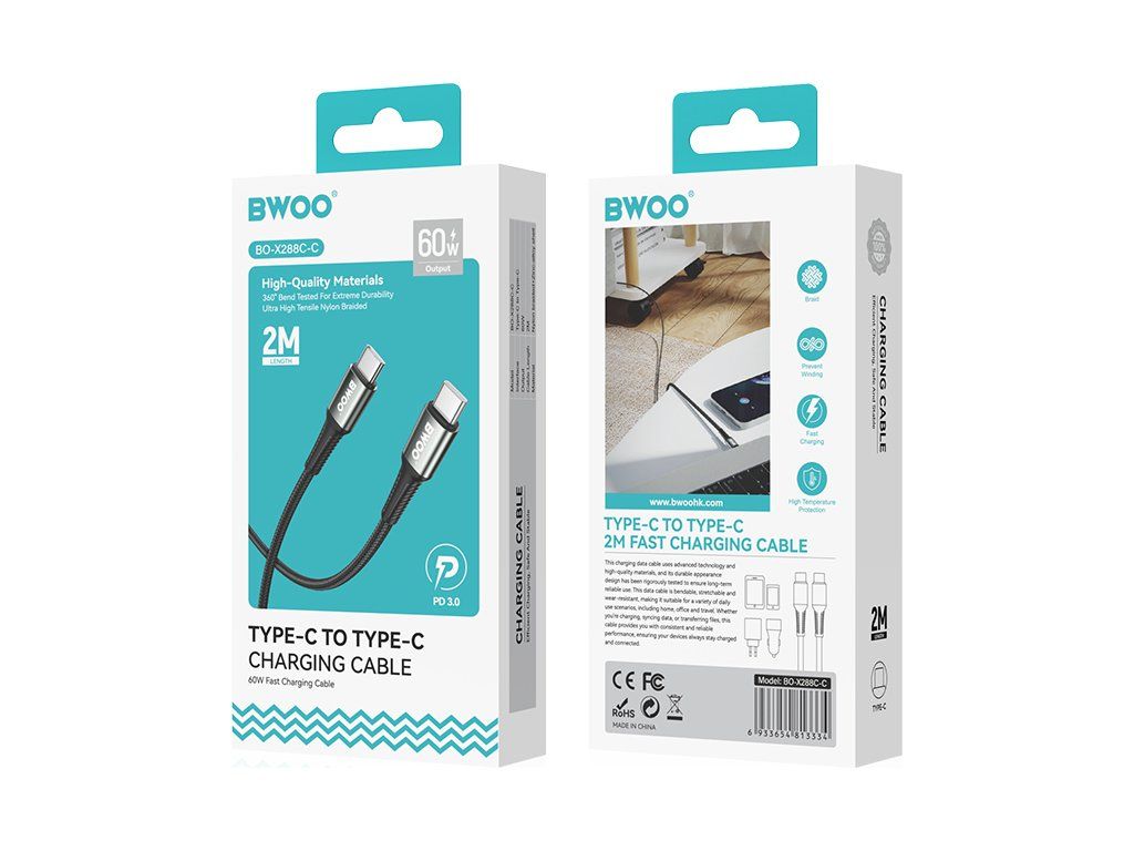 Pletený kabel BWOO USB-C - USB-C 2m 60W černý