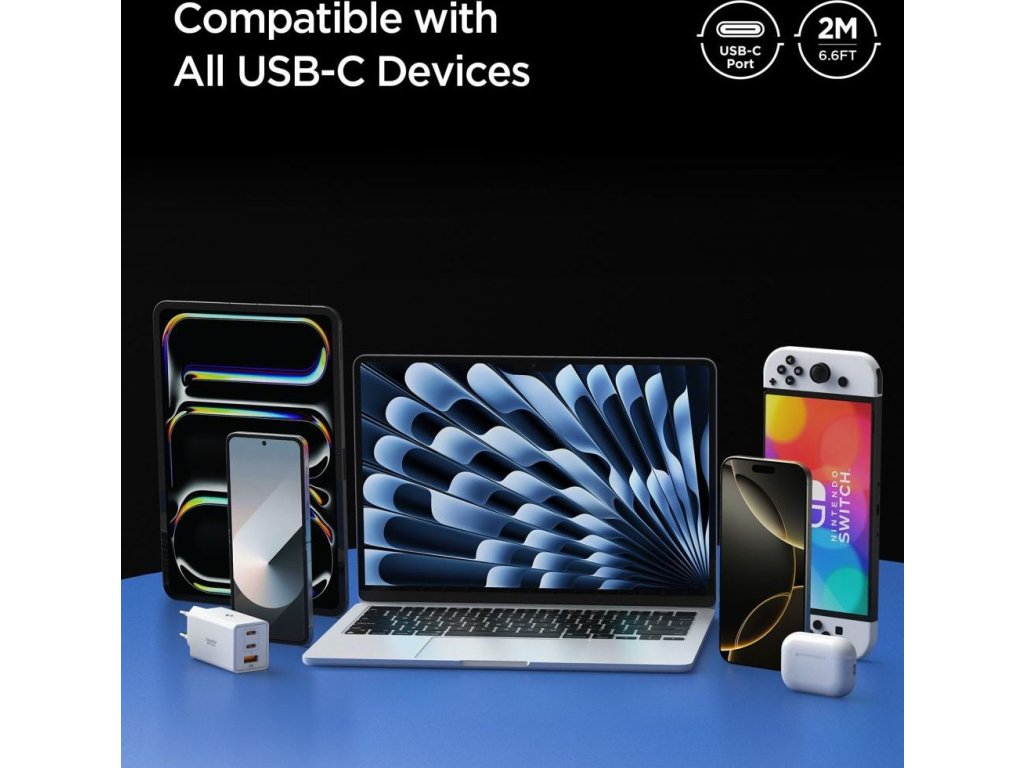 Délka 200 cm zajišťuje pohodlné použití doma, v kanceláři i na cestách a eliminuje potíže s krátkými kabely. Odolná konstrukce s flexibilním TPE a zesíleným PVC pláštěm spolu s technologií Durabend, testovanou na více než 10 000 ohybů, zaručují výjimečnou odolnost a trvanlivost při každodenním používání. Robustní zástrčky s čipem E-Marker chrání zařízení před přetížením a zajišťují bezpečné nabíjení.