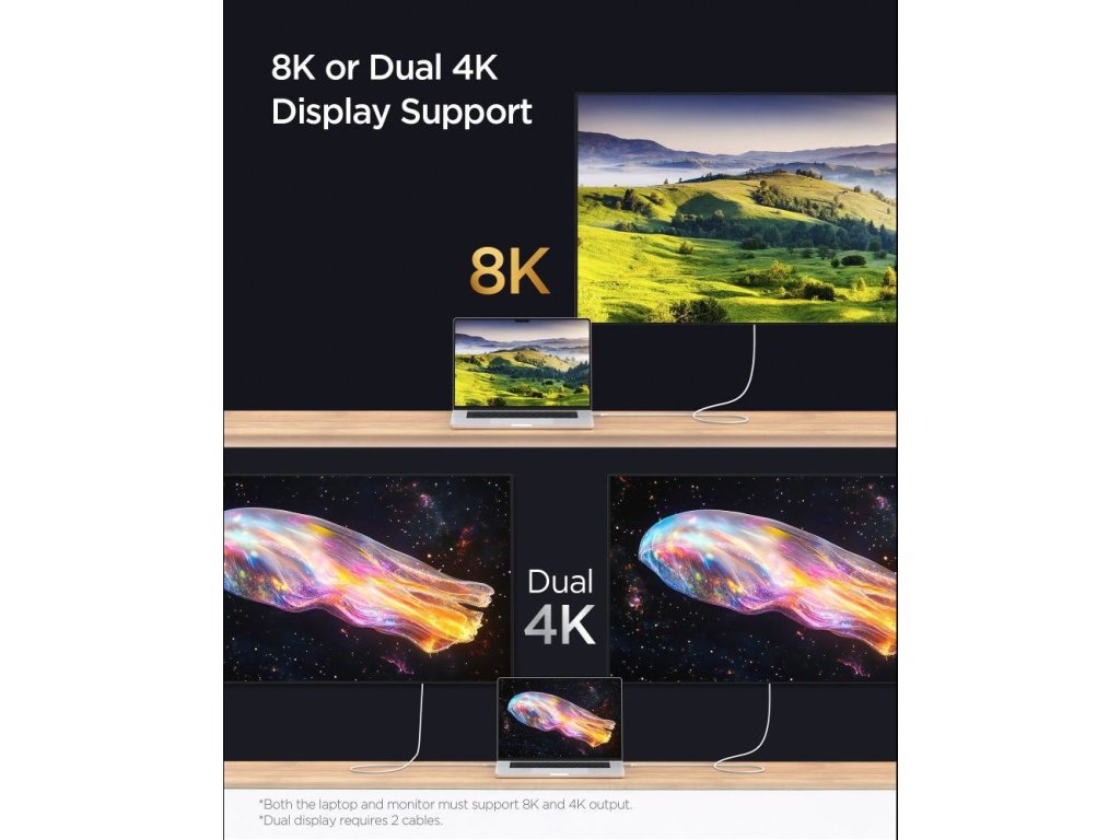 Díky podpoře standardů Thunderbolt 3/4 si kabel poradí i s náročnými úkoly – podporuje přenos videa v rozlišení 8K (jednoduché) / 4K (duální) pomocí DisplayPortu 2.0, což z něj činí skvělou volbu pro připojení monitorů, notebooků nebo dokovacích stanic.