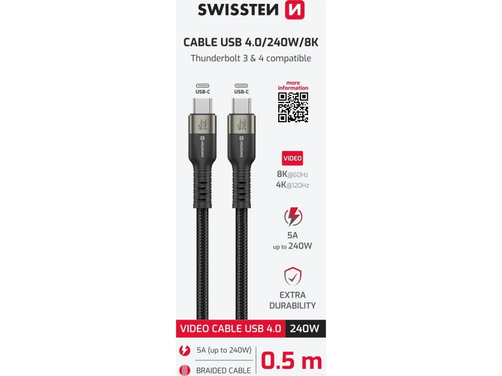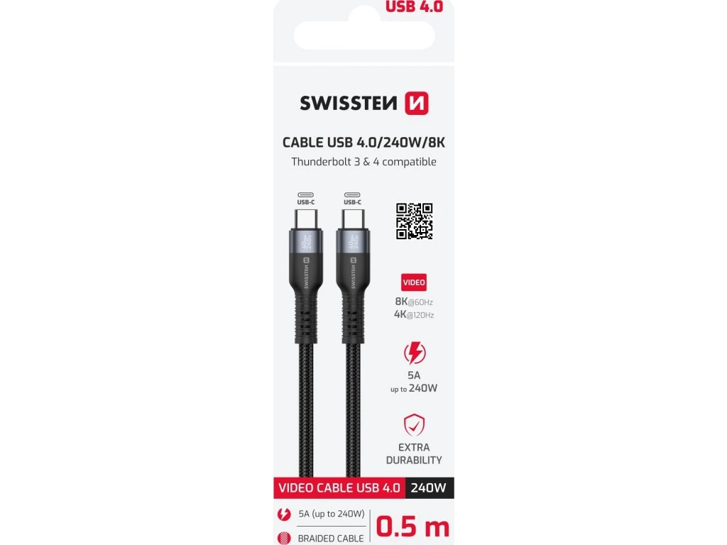 Swissten datový video kabel USB 4.0, Přenos obrazu 8K@60Hz / 4K@120Hz, Univerzální kompatibilita Thunderbolt 3 & 4, Rychlý přenos dat 40 Gb/s, Rychlé dobíjení až 240 W, Odolné zpracování, USB-C na USB-C, Délka 0,5 m. Baleno v blistru SWISSTEN.