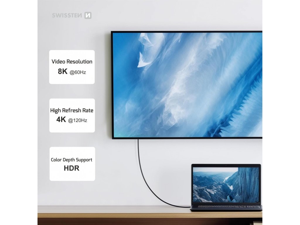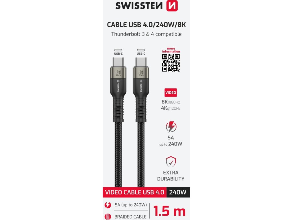 Swissten datový video kabel USB 4.0, Přenos obrazu 8K@60Hz / 4K@120Hz, Univerzální kompatibilita Thunderbolt 3 & 4, Rychlý přenos dat 40 Gb/s, Rychlé dobíjení až 240 W, Odolné zpracování, USB-C na USB-C, Délka 1,5 m. Baleno v blistru SWISSTEN.