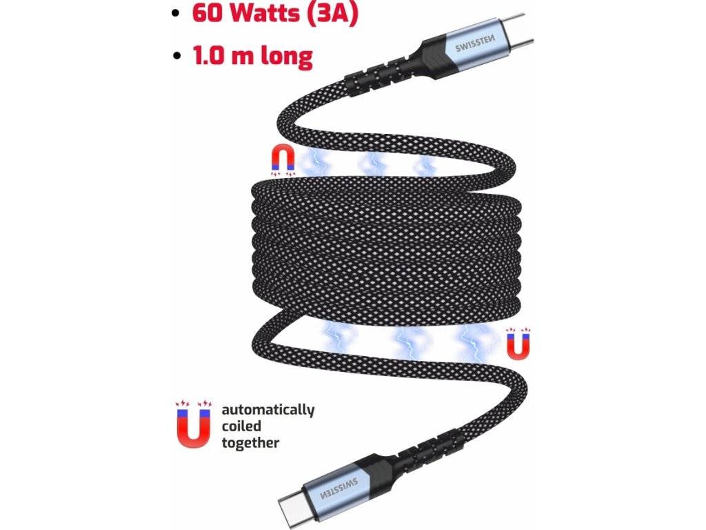 Magnetický samonavíjecí kabel Swissten s datovým přenosem, USB-C - USB-C, Délka: 1.0 metrů, Výkon: 60 W, Výstupní proud: 3 A, Rychlost přenosu dat: 480 Mb/s. Baleno v blistru Swissten.