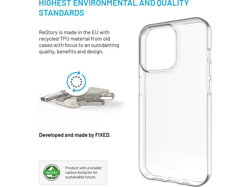 Recyklovaný ochranný kryt FIXED ReStory spojuje prvotřídní zpracování s důrazem na lokální výrobu. Byl kompletně vyvinut, vyroben i zabalen v České republice s maximálním ohledem na kvalitu zpracování a životní prostředí. Kryt je vyroben z minimálně 80 % recyklovaného TPU materiálu, pocházejícího z nevyužitých a neprodaných krytů. Přesto si zachovává stejnou odolnost a životnost jako kryty z nového materiálu, což potvrzuje i certifikace ISCC+. TPU kryt je pružný, příjemný na dotek a odolný vůči opotřebení. Díky tomu se kryt snadno nasazuje, neklouže v ruce a přesně sedí na daný model telefonu. Spolehlivě ho tak chrání před pády, nárazy, škrábanci i nečistotami. Zvýšené okraje kolem displeje a fotoaparátu zajišťují jejich dodatečnou ochranu. FIXED ReStory je ideální volbou pro každého, kdo hledá kvalitní, stylový a ekologicky šetrný kryt s českým původem.